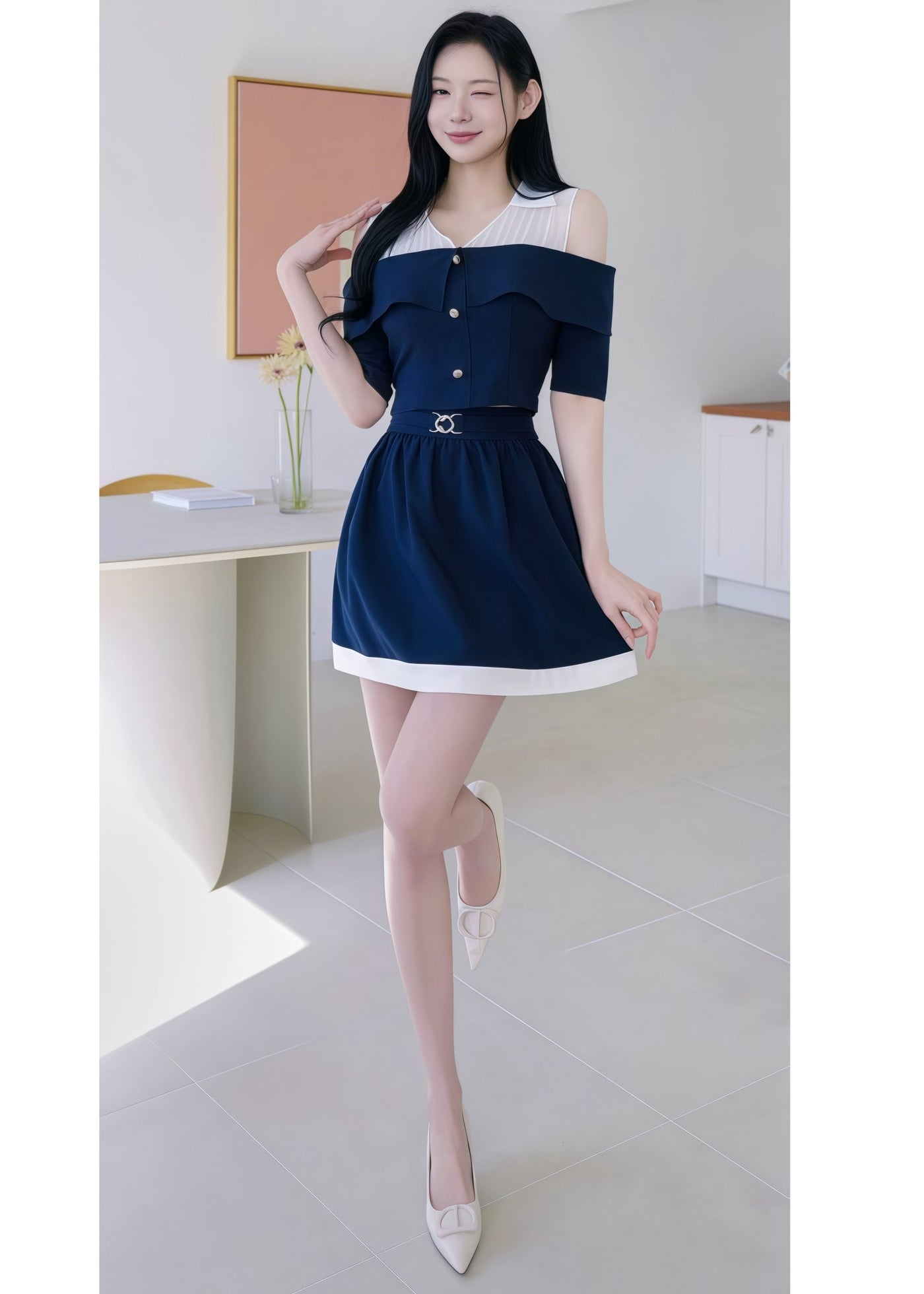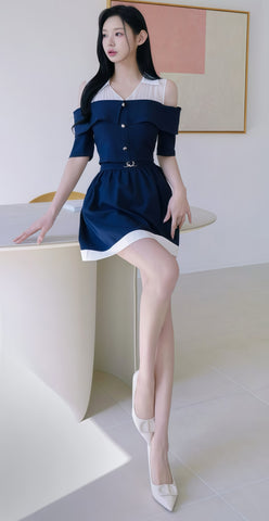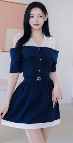 two-piece outfit with cold shoulders and white contrasting (0410TB008/0410SK009) - TOP / S / NAVY