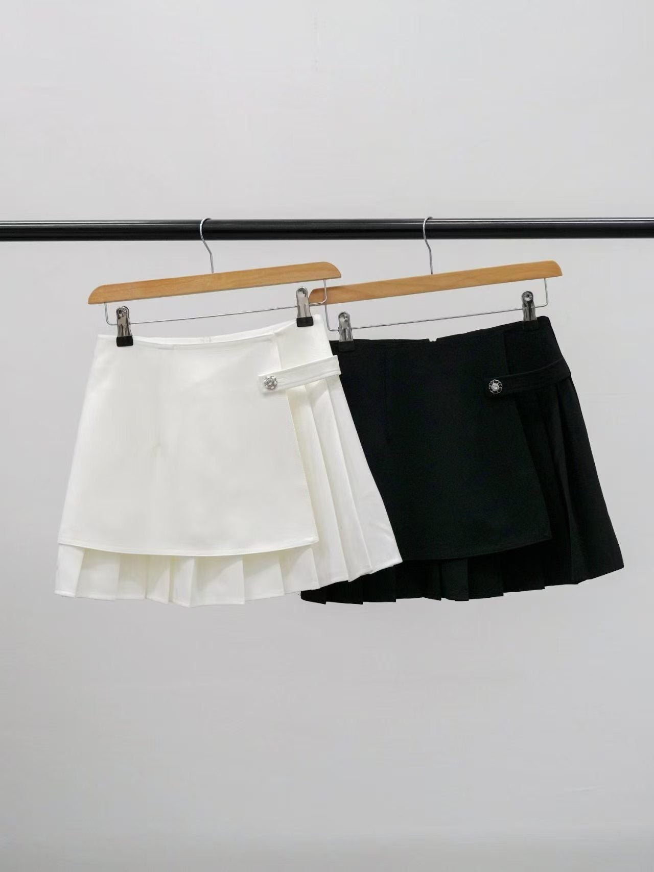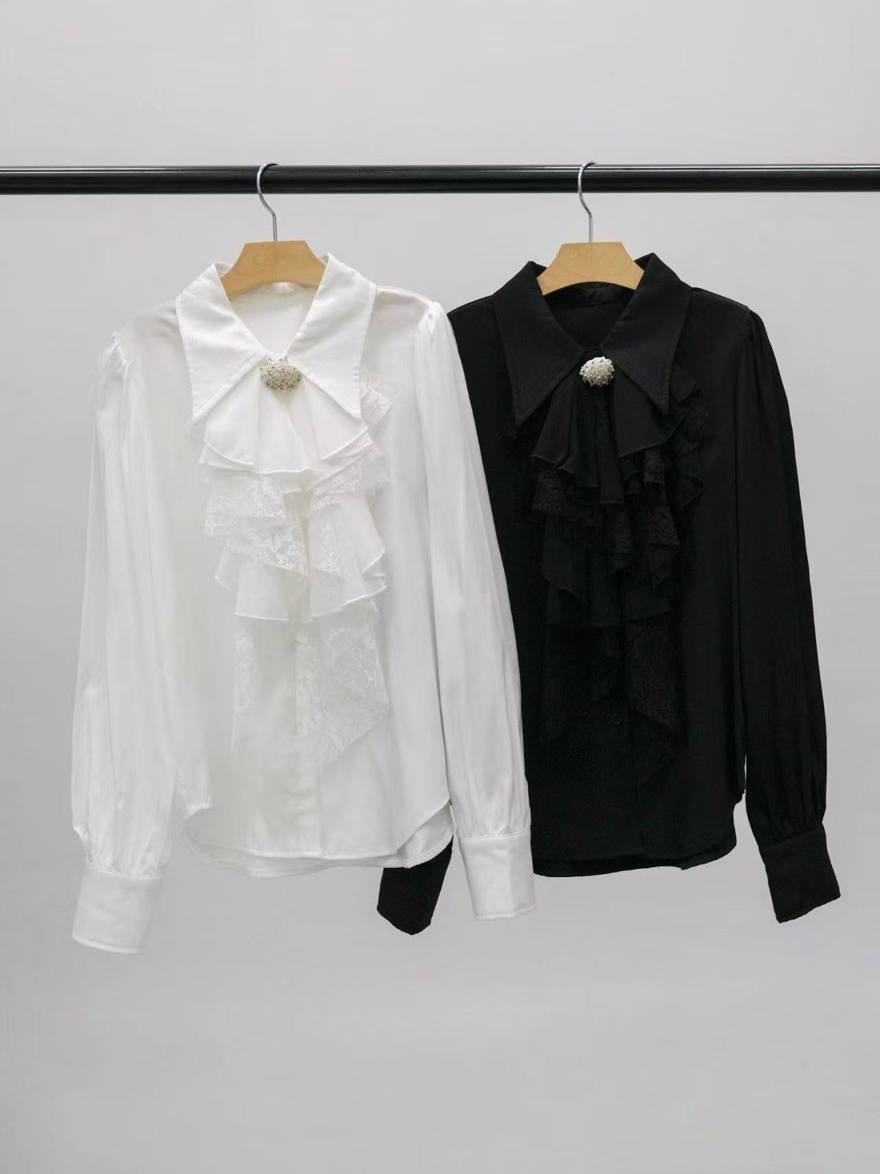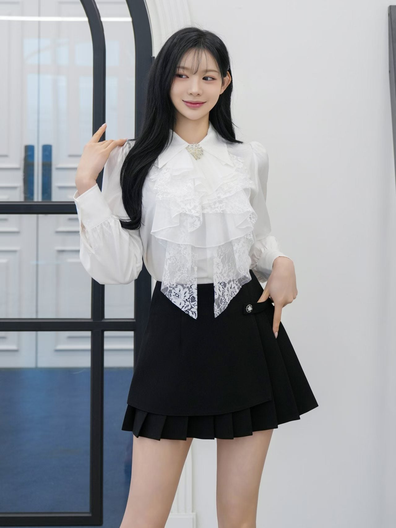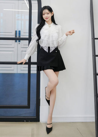Ruffled lace blouse with brooch & mini Skirt (0411TB170/0411SK164) - TOP(size:free) / FREE / BLACK